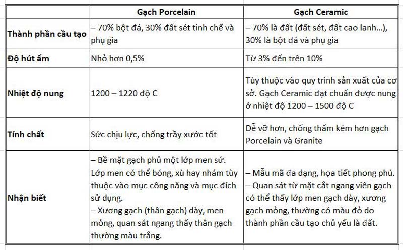 Còn gạch Ceramic được làm từ 70% đất sét + 30% bột đá, phụ gia, nung ở 1000 độ C. Vì vậy, gạch Ceramic có độ cứng, độ hút nước, độ bền kém hơn so với gạch bán sứ.