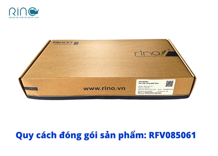 Hộp sản phẩm vòi chậu nóng lạnh Rino RFV085061 theo quy chuẩn đầy đủ bao gồm: 01 vòi chậu nóng lạnh + 01 đôi dây cấp + 01 xifont + 01 phiếu bảo hành chính hãng.